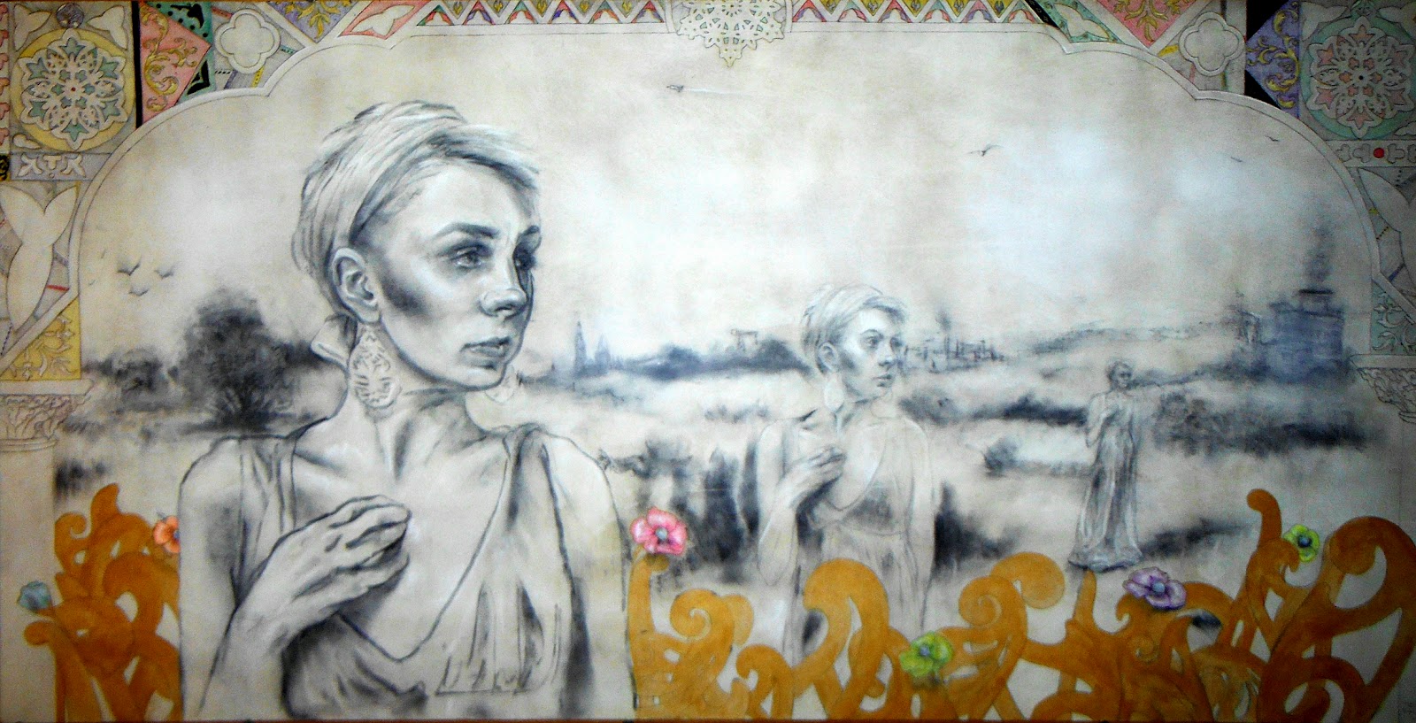 Not only is there weekly figure drawing within walking distance from my new location, but there's a (locally owned!) art store too, so when I decided that the letters in the background needed to be orange, not black, I was able to go get orange ink and make this piece, start to finish, during the days of the storm.