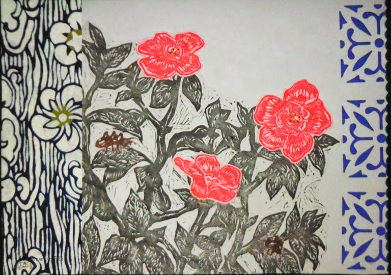 If you're a regular blog reader (Thank you!), and you may be wondering:"Wait, didn't we already see these?" Yes and no - I'd printed the blocks and arranged these (The first 90%), but this week, I glued them down, sewed them to the paper, and added shadows and reflected color (the last 10% is tough :) ).